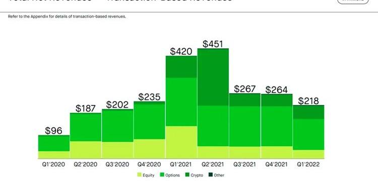 然而,隨著美股二級市場的萎靡,Robinhood也每況愈下。今年第一季度,Robinhood凈收入總額同比下降43%至2.99億美元。其官方表示,每月活躍用戶從一年前的1770萬下降到1590萬。