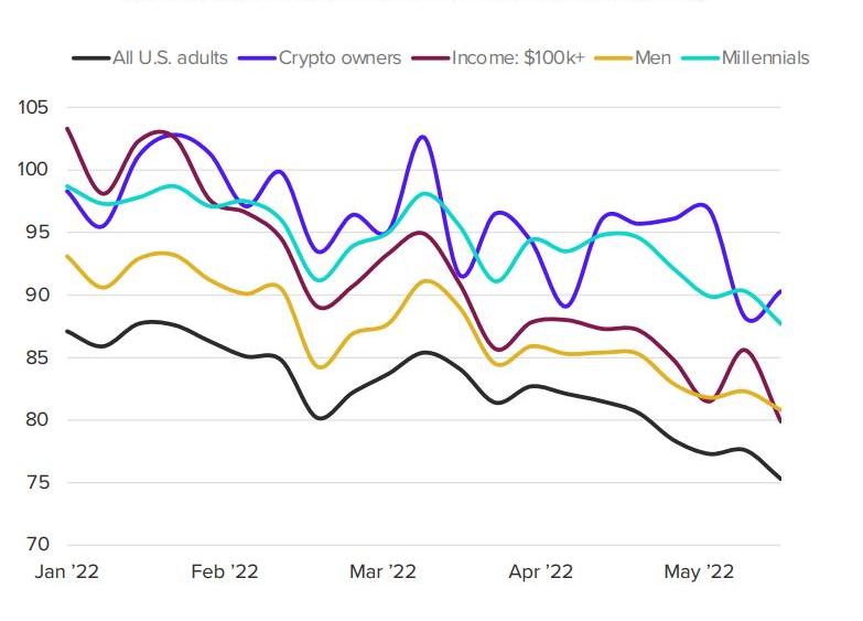 研究公司MorningConsult7月7日的一份報告顯示,盡管自1月中旬以來,美國成年人的平均消費者情緒下降了13.5%,但加密貨幣持有者的信心相對較好,同期僅下降了8.1%。