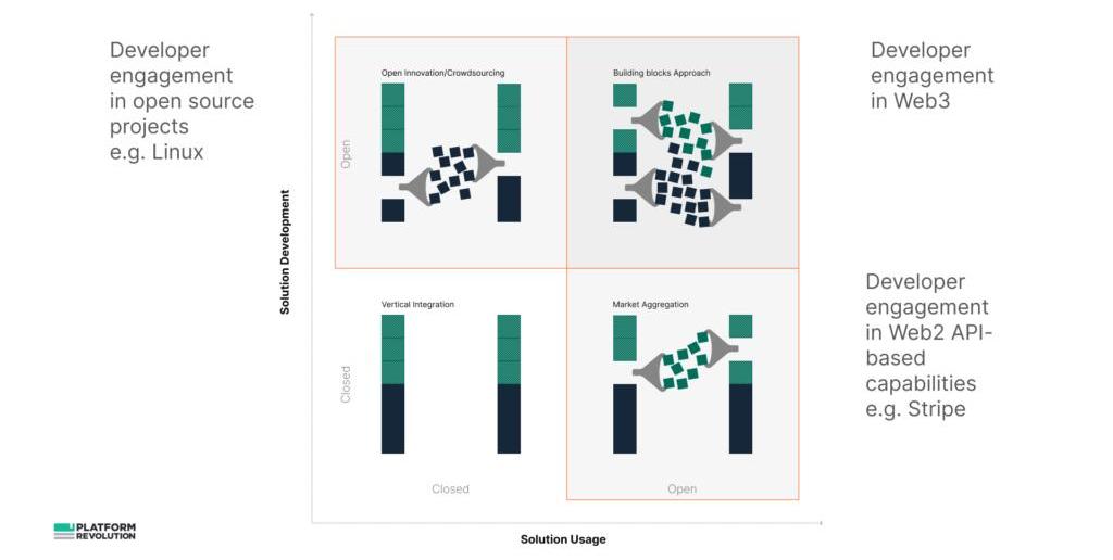Web3生態系統的獨特之處在于,這些生態系統通過促進解決方案的使用,吸引開發者從事價值創造、解決方案開發和價值分配。這在右上象限中顯示。