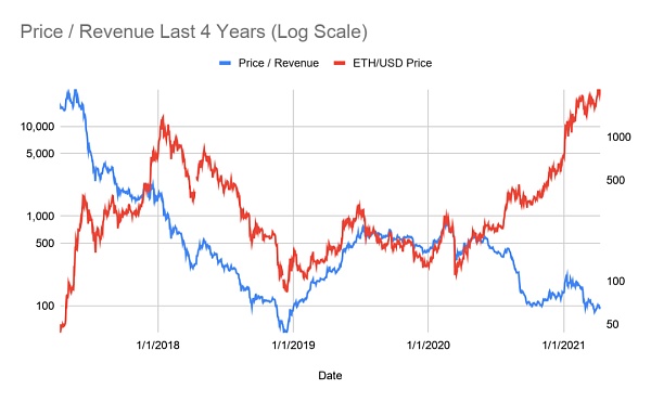 該比率是一個回溯性的衡量標準。以下是ETH從2020年4月到現在的價格/收入統計數據: