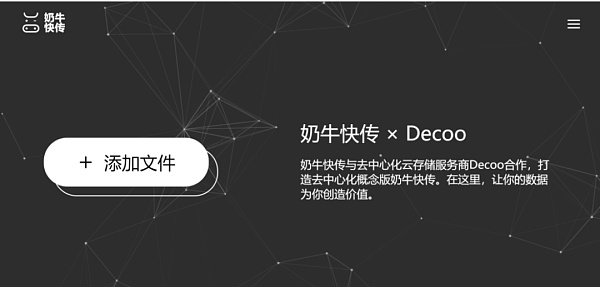 Decoo與奶牛快傳的產品正在開發中,所以目前只能通過Decoo官網首頁decoo.io的一個“小裝置”來體驗“分布式云版本的快傳”是如何使用的。下圖中首頁的“Add File”允許用戶上傳本地文件到IPFS。