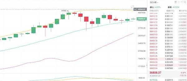 比特幣近兩日依然處于高位震蕩,昨日晚間至今天凌晨一路震蕩下行至最低點位35398一線,而后開始回調,一直持續到今天下午,最高點位到達37527附近。目前幣價在36800附近運行。