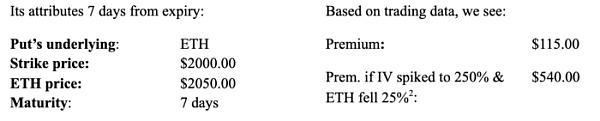 -標的資產:ETH;行權價格:2000 美元;ETH當前價格2050 美元;到期時間:7 天后;期權費:115美元;如果隱含波動率飆升到250% 且ETH 價格下跌 25%,期權費將是:540 美元-