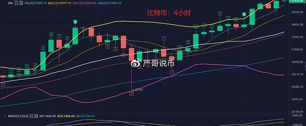 日線級別的圖上看,價格連續兩天收陽,低位在不斷上移,目前行情延續上行趨勢,各均線均保持上攻姿態,上軌軌道較為良好。后續若價格進一步向上試探突破38200一線,今日晚間行情繼續上攻38600區域的可能。整體行情重回新高之勢,40000關口就在不遠方,嚴哥建議各位幣友順趨勢回調后找準位置多單為主。