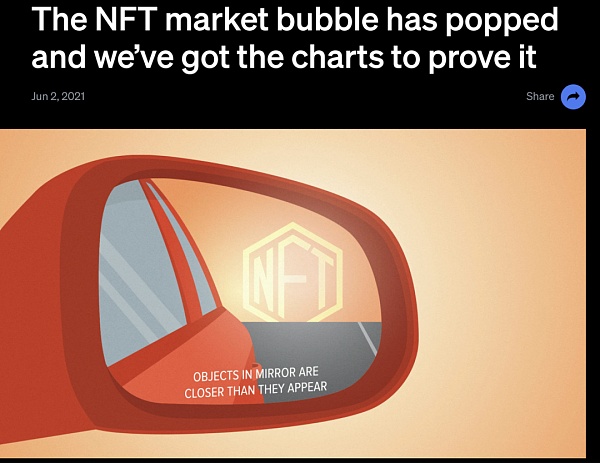 然后,時間來到四月份,加密資產價格暴跌,NFT 賽道也隨之涼了下來。那些質疑 NFT 的人嘲諷道:「你看,我早就跟你說過,當人們愿意花上百萬美金買一副 jpegs 格式的圖片時,這個泡沫可太大了!」