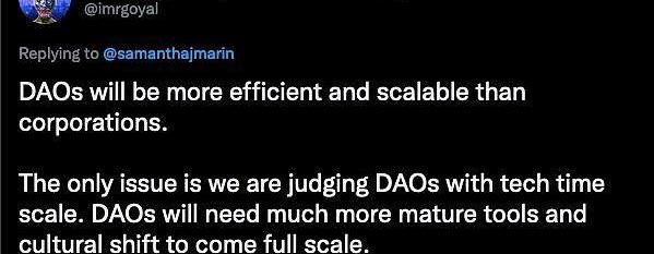 DAO將比公司更有效率和可擴展性。唯一的問題是我們正在用衡量技術的時間尺度來判斷DAO。DAO將需要更成熟的工具和文化轉變才能全面發展。