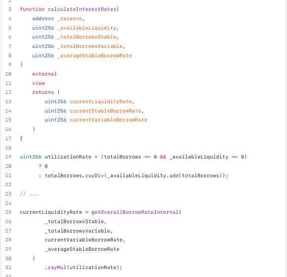 正如我們可以在DefaultReserveInterestRateStrategy.sol合約中看到的那樣,liquidityRate是通過以下方式定義的: