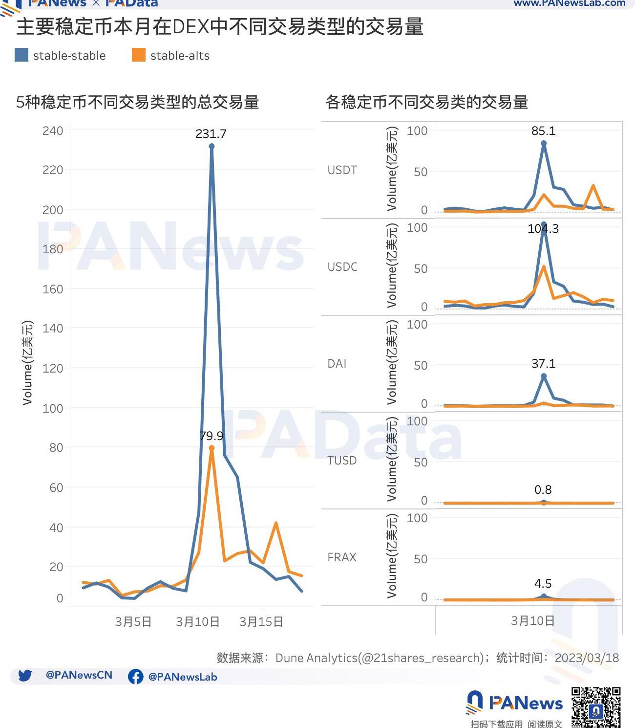 其中有一些穩定幣的鎖倉量18日較11日的變化值得關注,比如此期間,USDT在3個DeFi協議中的鎖倉量都大幅上升,最高在Uniswapv3中上升超94%,最低在Curve中也上升近40%。而USDC的鎖倉量則在Uniswapv3和Curve均有所下跌,且跌幅不小。另外,FRAX、TUSD、SUSD、LUSD、MIM、USDD、MAI的鎖倉量在這3個協議中全部下跌,FRAX和TUSD在AAVEv2中的鎖倉量下跌超70%。相反,法幣穩定幣BUSD和GUSD的鎖倉量則在上升。從DEX中各穩定幣交易對的類型能更準確地捕捉到近期穩定幣在DeFi中的流向。3月11日,DEX中穩定幣交易對的交易總額達到了231.7億美元,遠超本月初日均10億美元左右的規模。而且,當天穩定幣與其他代幣交易對的交易總額也達到了79.9億美元,同樣創造了一個小高峰。總體而言,USDC脫錨后,穩定幣之間的交易變得極為活躍。如果進一步觀察主要穩定幣的穩定幣交易對的交易量,可以看到,11日USDC穩定幣交易對的交易量達到104.3億美元,而USDT達到了85.1億美元,DAI約為37.1億美元。有理由推測,這3種穩定幣之間的交易構成了危機下穩定幣在DeFi中的主要流動路徑。