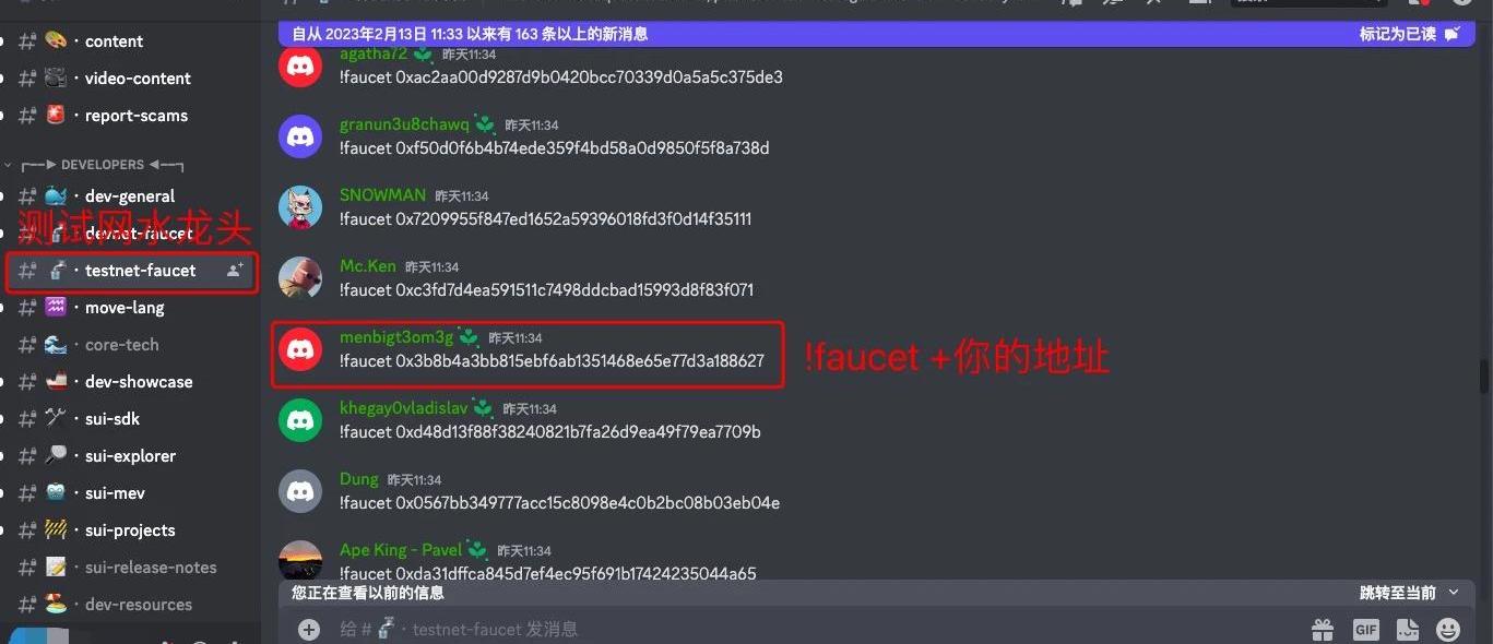 SuiWallet安裝完成后,選擇到Sui測試網。由于錢包中沒有測試幣,需要前往水龍頭領取——復制錢包地址,前往SuiDiscord社區「測試網水龍頭」頻道領取測試幣