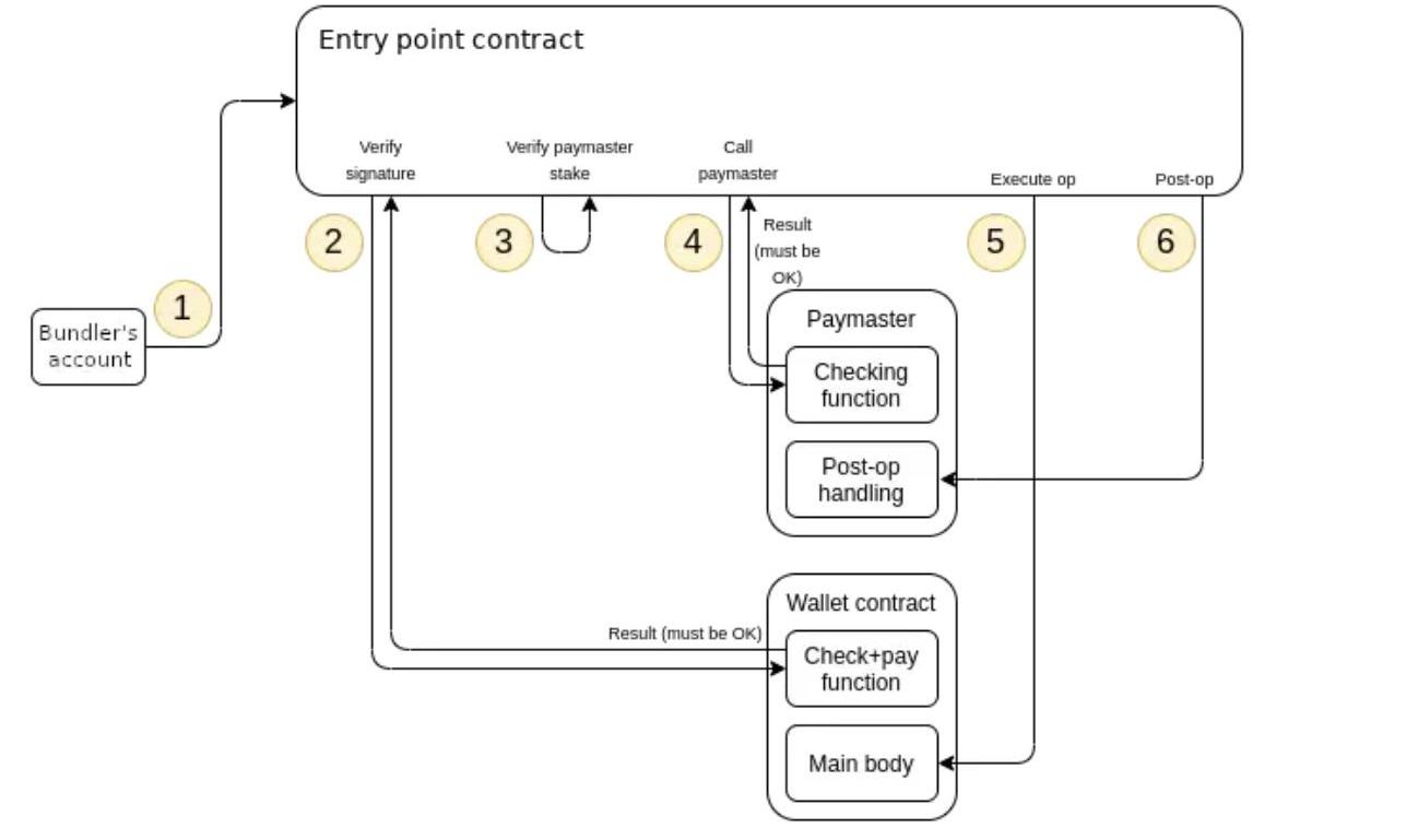 EntryPoint合約是通過Bundler調用的基礎設施的關鍵部分。調用此智能合約首先驗證UserOperations是否遵循帳戶預先指定的規則,然后執行它們。重要的是要記住EIP-4337沒有協議級別的變化。這意味著Bundler是一個EOA地址,將所有這些交易提交到鏈上。可以通過添加Paymaster進一步擴展EntryPoint合約。Paymaster提供了一些好處:1.它允許應用開發者代表他們的用戶支付費用2.它允許用戶以ERC20代幣支付費用,合約作為中介來收集ERC20并以ETH支付gas費用