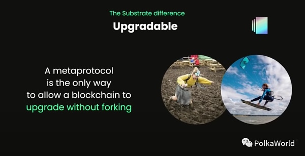 第二點就是可升級性。雖然這一點你們很多人可能都耳熟能詳了,但是還是有必要再強調一下。它是 Substrate 和 Polkadot 的重要口號和核心精神,Substrate 鏈和基于 Substrate 創建的 Polkadot 都是元協議(Meta Protocal)。所以它讓我們可以高效地升級、更新和吸收新技術。