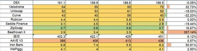 近期BSC和Tron占比出現明顯增長,分別從9.88%和9.9%上升至10.43%和10.79%,而Solana鏈TVL出現大幅削減,從2.43%下降至1.77%,下降幅度達27%,生態損失嚴重,其余各小鏈增長困難,整體占比依舊維持在9.1%附近。3.各鏈協議鎖倉量情況