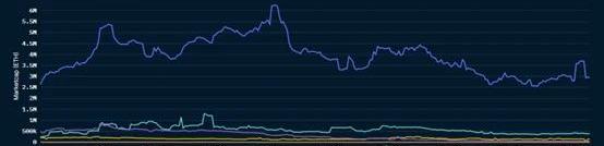 當前整體TVL總量已跌破6月中旬時的最低點,短期仍有繼續向下空間,本周下跌幅度7.8%。2.各公鏈TVL占比情況