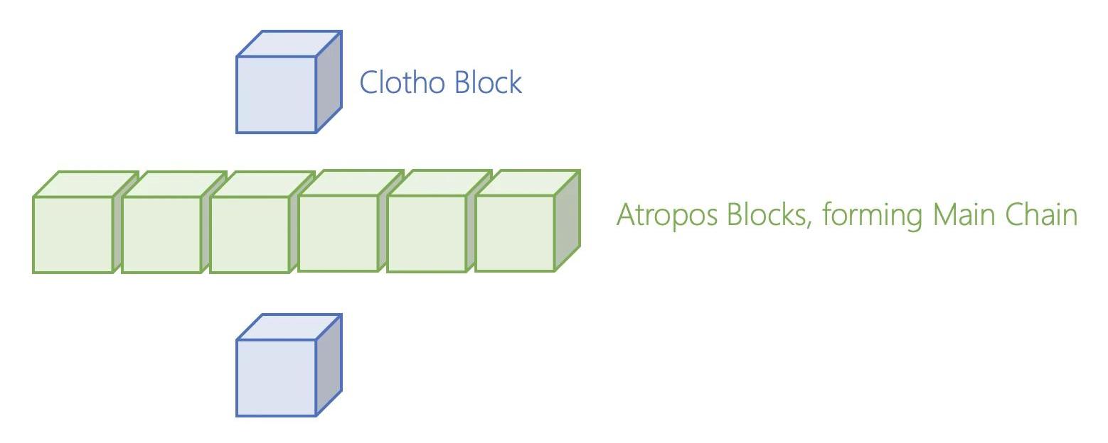 根據彼此之間的通信信息,Clotho塊之間達成共識來創建另一個事件塊,稱之為“Atropos”塊。每個Clotho塊在創建時都有一個特定的時間戳。如果所有節點中至少2/3的節點時間相同,則Clotho塊將成為Atropos塊。這些Atropos塊串聯在一起構成“主鏈”。主鏈可以看作是DAG結構中的區塊鏈。每個Atropos塊都與其他Atropos塊相連接,共享從Clothos塊收集來的信息,而Clothos塊的信息又來自所有其他事件塊。