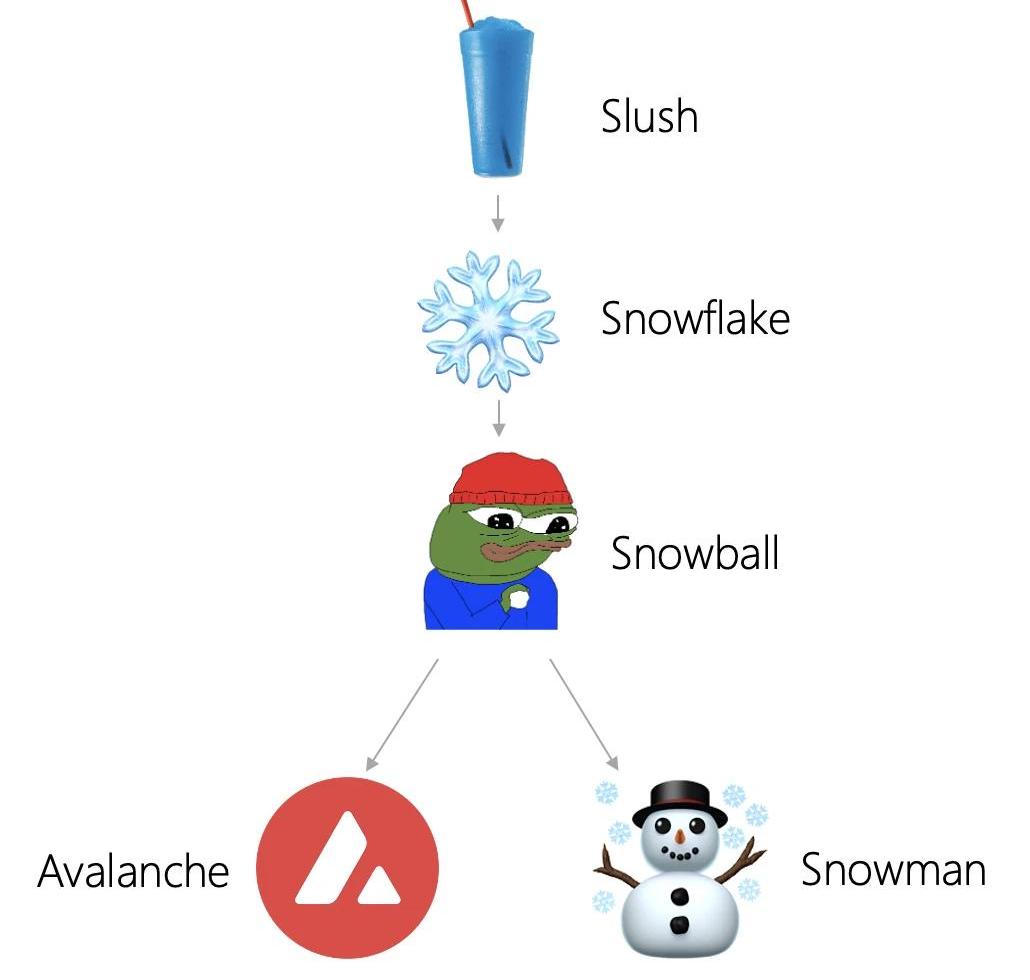節點之間將進行多輪通信,直到所有節點達成共識。目標是讓每個節點在顏色上形成一致。當節點傾向于某個顏色時,這將加強該傾向并將正確結果導向于該顏色。這個概念是Avalanche的構建基礎,一切都建立于此概念之上。Avalanche的第二個構成部分是Snowflake協議。在節點導入內存時,每個節點都有一個計數器。每當進行Slush協議通信返回相同顏色時,計數器都會加1。而每當節點反轉結果返回不同顏色時,計數器都會重置。一旦計數器達到足夠大的數字時,它將鎖定其狀態并防止節點改變顏色。這將有助于鞏固真實的顏色。節點在第三個階段Snowball協議中將以更大的內存記錄數值。Snowball協議在Snowflake協議的基礎上增加了置信度。Snowflake協議的節點不是根據與之通信的其他節點來改變顏色的,而是通過回顧自身所有的顏色變化歷史,并根據節點的置信度狀態來改變顏色,置信度考量了該節點的投票變化歷史數據。以上所有階段最終導向Avalanche協議。Avalanche是一個僅能添加的DAG結構。Avalanche也可以在沒有DAG結構的情況下運行,比如Avalanche在合約鏈(C-Chain)和平臺鏈(P-Chain)上的線性結構即是這種情況。Avalanche共識的開發團隊TeamRocket認為DAG架構優于區塊鏈,因為DAG架構每個交易的投票都聯動其添加的所有交易,所以DAG的投票機制更有效率。