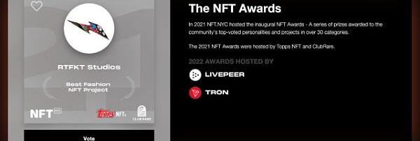 所有“揚聲器”NFT都具有實際用例,演講者可以將NFT添加到他們的Linkedin個人資料中,作為他們對活動貢獻的證明。NFT獎——表彰頂級創作者和建設者NFT.NYC年度大獎頒發給了56個不同類別的頂級藝術家、品牌、區塊鏈和項目。通過Twitter民意調查接受提名,并使用HubSpot表格進行投票。該獎項由OpenSea、APENFT、Livepeer和Tron共同主辦。