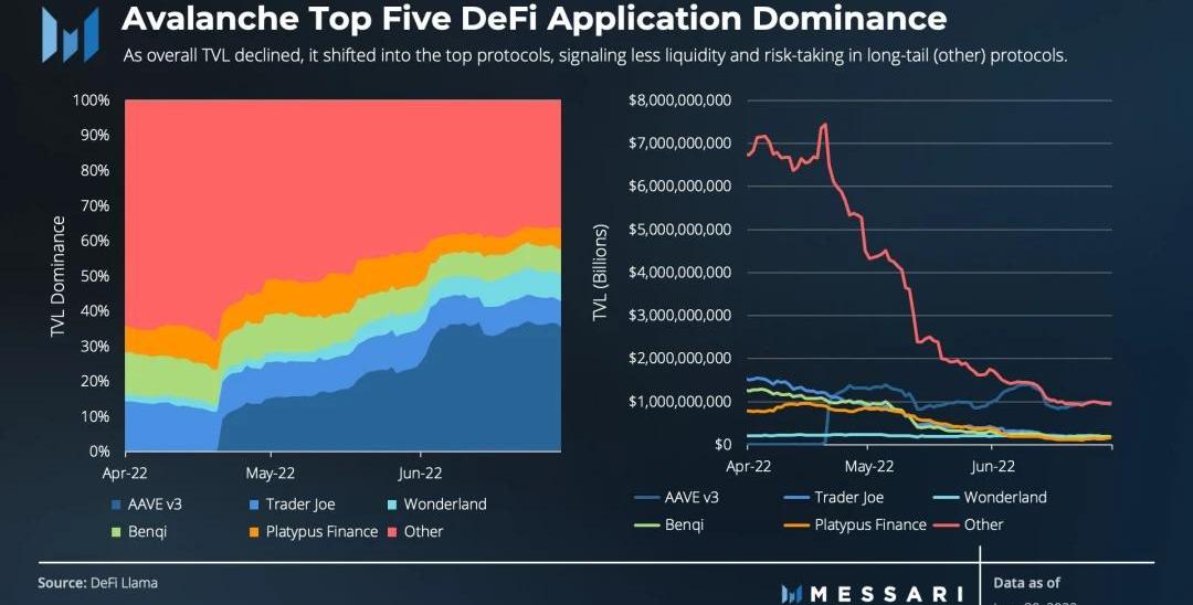 隨著整體TVL的下降,AvalancheDeFi生態系統向頂級協議轉移,表明流動性和風險承擔通過長尾協議中的流動性挖礦來減少。