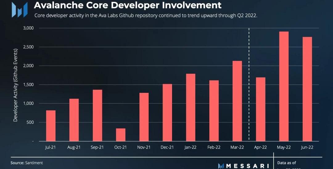 盡管目前的市場條件,AvaLab的Github倉庫中的事件數量在整個第二季度顯著增長(33.1%)。由于這是迄今為止的第二大增長,該網絡的核心貢獻者似乎在基礎設施建設中取得了成功。