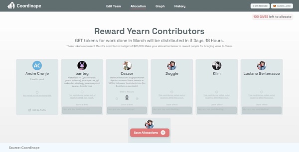 另一個能夠幫助 DAO 進行成員擴張的是將 DAO 分為更小的子群組,這些子群組將獨立運作并專注于不同的特定任務(開發、市場等等)。第一個分組成功的項目是 Yearn Finance。Yearn 的迅速增長及持續的產品迭代讓其不得不將團隊分成不同的小組來完成前端 UX、核心協議開發,以及市場等不同任務。tracheopteryx、zemm,以及 zakku 等早期參與者創建了 Coordinape,以此幫助貢獻者進行協同。這一產品讓 DAO 能夠順利地管理匿名貢獻者的工資發放,不管他們是在哪個地區。