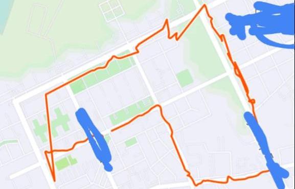上圖:信號丟失的結果3.GPS不穩高層建筑通常會導致GPS信號在移動設備和衛星之間來回晃動。這通常會形成如下圖所示的“跳躍”型GPS軌跡。而這樣不準確的GPS數據通常會導致記錄的距離比玩家實際行進的距離要多,因為GPS軌道上的每個曲線都必須用連接它們的直線來進行計算。