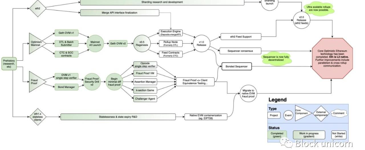 OVM代表樂觀虛擬機,是在OEL2中執行所有事務的虛擬機。OVM將于11月11日升級。樂觀主義正在走向EVM等價的道路,為了實現這一目標,他們推出了OVM2.0,這將使OE在所有方面成為與EVM等效的編譯目標。Dapptools、Hardhat、Solidity、Vyper等開發人員工具以及所有其他工具都可以在OVM2.0上本地運行,而無需這些工具的開發人員擔心支持碎片化的代碼庫。這就是以太坊社區中每個人都提到的強大的“網絡效應”。需要注意的是,EVM的任何競爭對手都必須從頭開始重建所有這些開發人員工具。您可以在他們的博客文章中閱讀更多關于Optimism的EVM等效之旅,追溯性公共物品資助。在我看來,Optimism團隊最重要的公告之一是他們承諾將總計超過100萬美元的利潤捐給公共產品,并追溯使用二次投票。Optimism團隊還承諾繼續將L2音序器的利潤100%捐贈給未來的公共產品。利潤是產生的交易費用收入與L2為向以太坊主網提交欺詐證明而必須支付的成本之間的差額。這為其他L2設置了優先級,為以太坊社區提供利他主義的前景。Optimistic的未來OptimisticEthereum對未來有雄心勃勃的計劃,路線圖可在Optimism文官網檔中找到。取自他們的官方文檔: