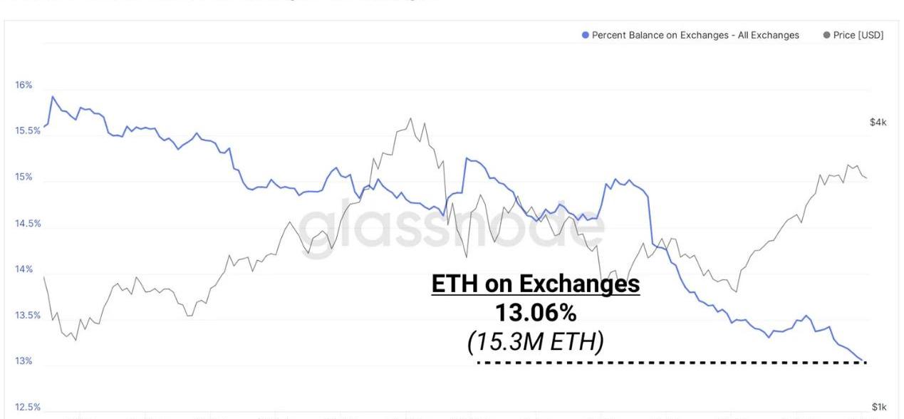 除了NFT之外,DeFi和ETH2.0質押等活動也都在支撐ETH的市場需求。最直觀的體現是,ETH在交易平臺的余額持續下降并再次創下新低(截止到8月19日,交易平臺上的ETH余額僅有1530萬枚,僅占流通總量的13%)。