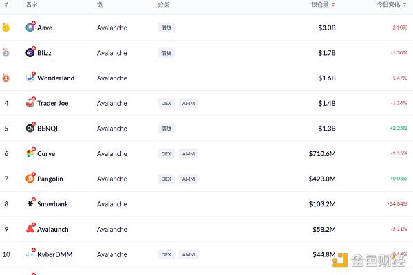 Avalanche鏈上DeFi鎖定資產前十排名及鎖倉量,數據來源:Debank