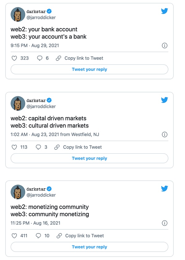 Web2以平臺為核心,用戶被迫于中心化平臺的監管,甚至是政府的監控,并不能得到最大化利益。而web3擺脫了平臺的限制,將自己的作品打磨好放在去中心化平臺上,并且將自己的個人品牌包裝成可販賣的token,從而獲得利益最大化。平臺用戶擁有真正的所有權、自主權和控制權。