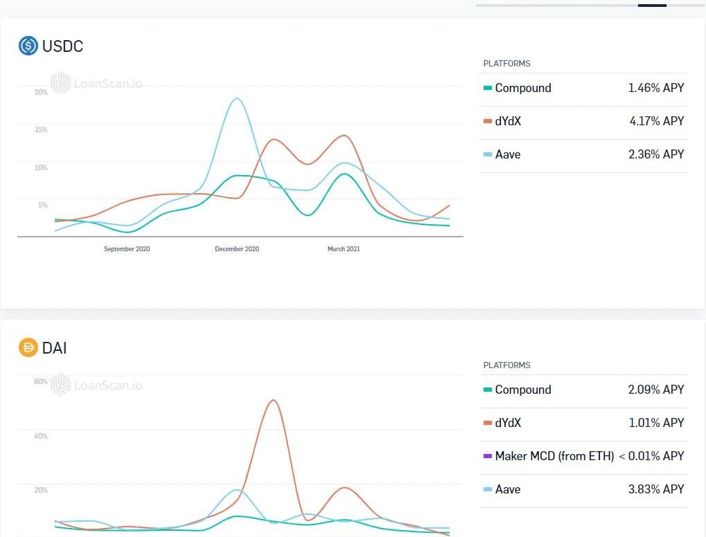 穩定幣無損挖礦的收益率到底怎么,我們從以太坊、BSC和Polygon三條鏈看一看。以下數據來源APY助手,主要顯示的是一池無損挖礦年化收益率。以太坊鏈:AAVE:USDT2.41%;DAI0.71%dForce:USDT4.05%;DAI3.36%Compound:USDT1.3%;DAI2.39%Yearn:USDT3.84%;DAI7.16%DFI:USDT13.36%;DAI16.56%BSC鏈:Alpaca:USDT9.77%;BUSD9.86%Autofarm:USDT11.5%;BUSD9.85%Belt:USDT2.9%;BUSD3.5%Bunny:USDT3.83%;BUSD3.33%Venus:USDT3.6%;BUSD3.13%YFII:USDT14%;BUSD31.72%Polygon鏈:AAVE:USDT1.68%;USDC0.97%ForTube:USDT2.15%;USDC2.49%Solo:USDT14.95%;USDC7.93%Supremex:USDT23.55%;USDC10.85%不難發現,大部分項目的美元穩定幣無損挖礦收益率已經不是非常誘人。至少在上述三條公鏈上的表現就是如此,部分知名項目的無損收益甚至低于支付寶的貨幣基金。此外,Loanscan數據顯示,USDC和DAI的存款利率,在過去一年也發生了非常大的變化,距離歷史高點均有非常大的回撤,以Aave為例,歷史高點在2021年1月,利率接近20%,但半年之后的今天已經下降至2.36%。