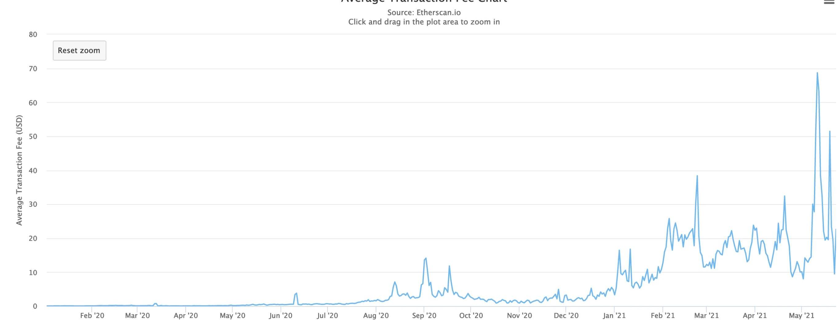 挖礦獎勵由一個固定的區塊鏈獎勵以及交易費用獎勵組成,這意味著找到區塊的礦工將接收到一個固定的區塊獎勵(比特幣網絡為6.25BTC,以太坊網絡為2ETH)以及區塊鏈用戶支付的所有交易費用(所有ETH以及ERC20交易)。2021年5月12日至13日期間,ETHASH算法(即以太坊)的挖礦收益躍升到頂峰的一個主要因素即是當時Defi用戶在以太坊區塊鏈網絡上發送了大量的交易,而以太坊交易需要支付一定的費用,這些費用將作為挖礦獎勵納入區塊獎勵中。例如,以太坊區塊#12421088的固定獎勵為2ETH,而交易費用則高達8ETH。如圖所示,2021年5月,網絡交易費用飆升。
