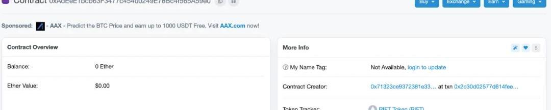 區塊鏈用戶的交易歷史記錄中包括所有的從該賬戶地址發起與被該賬戶接收的交易。每一條交易都有不同的目的和邏輯。為了查詢項目發布者是否有惡意欺詐歷史,需要從該賬戶所有的交易歷史記錄中查詢是否存在創建以惡意欺詐為目標的智能合約的交易。通過查詢可以發現該項目方除DarkMatter項目智能合約之外,還創建了另外兩個智能合約,它們的地址為:1.0x852B1106ce359ED128451dC753EA4c3289eefadD2.0xAdEeE1bcb63F3477c45400249E78Bc4f565A59e0根據準則第一條,項目發布者是否有惡意欺詐歷史,這兩個智能合約也存在極大的欺詐風險。經過對這兩個智能合約的源代碼驗證情況以及源代碼進行分析,第2個地址0xAdEeE1bcb63F3477c45400249E78Bc4f565A59e0是名為Rift項目的智能合約地址,并且該項目源代碼中存在與DarkMatter完全一致的安全漏洞。