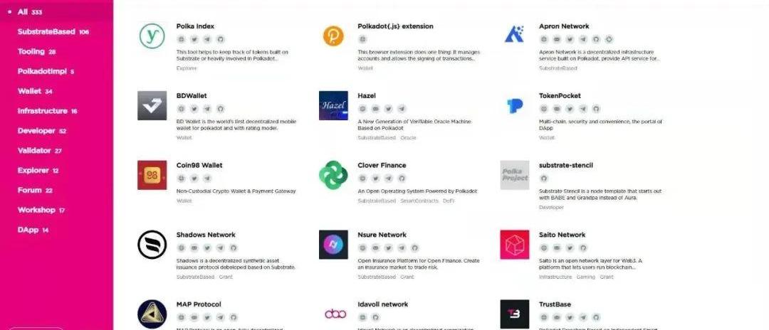 而波卡如今則不僅俘獲了交易平臺等資本的青睞,自身的生態建設也是穩步推進,幾乎成為目前“坐二望一”的“以太坊唯一對手”。根據PolkaProject截止1月13日的數據,目前波卡生態中已誕生了333個項目,其中包括Acala、ChainX等網絡底層設施,Zenlink等DEX,NoiseExplorer等開發工具,Polkawallet、Ledger等錢包,Validators等驗證器,還有Polkascan等區塊鏈瀏覽器,一個涵蓋底層技術、錢包、預言機、NFT、DAO、智能合約、橋接器、DeFi、物聯網和游戲的足夠豐富且多樣化的獨立生態已然成型。GavinWood在2020年年終總結中就提到:波卡已是第二大DeFi生態系統,2021年將逐步兼容以太坊。按圖索驥,波卡DeFi生態哪些賽道可能會跑出黑馬?