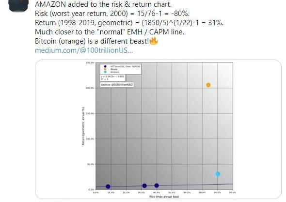 @Rhythmtrader“持有一個或一個以上比特幣的地址增長了近11%”知名交易員Rhythm在推文中表示,自去年以來,持有一個或一個以上比特幣的地址增長了近11%,從總數的707,000增至784,000。自2015年初以來,這一數字已增長了一倍以上。比特幣變得越來越分散,這是比特幣零售購買者增長的表現。@AshAEgan“2020將是瘋狂的一年”1月24日,風險投資公司Accomplice合伙人AshEgan在推文中披露約20億美金的未宣布資金流入美國加密貨幣基金。基金分布在3個大型基金、4個大型基金和4個小于1億美金的基金。2020年將是瘋狂的一年。@PlanB“比特幣是一頭異獸”1月24日,知名機構PlanB發布了一張圖,顯示BTC風險收益與亞馬遜股票,美國債券,黃金和標準普爾500指數的關系,顯示比特幣作為一項投資其在行為和表現的與眾不同。在2000年,亞馬遜遭受了巨大損失,即便是后來上演了其享有盛譽的復蘇,但至今仍遠低于比特幣的風險回報率。PlanB認為亞馬遜的風險收益“更加接近正常水平”。