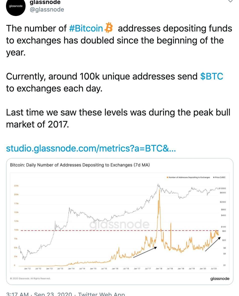 @glassnode“每日充值比特幣地址數已經翻倍,這和2017年牛市極為相似”9月23日,區塊鏈追蹤和研究機構glassnode在Twitter上表示,“目前,每日向交易所充值比特幣的地址數相比年初水平已經翻倍。現在每天共有10萬個地址向交易所發送比特幣,而上一次出現類似水平是在2017年牛市”。