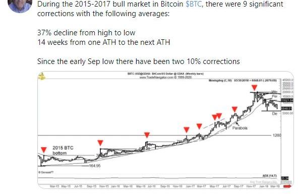 @PeterBrandt“當前比特幣的價格只是本輪牛市的開始”11月16日,交易員PeterBrandt在Twitter上分享了比特幣牛市特征圖標,根據2013年和2017年的牛市行情,當前的價格表現只是本輪牛市的開始。他解釋說:“在2015-2017年比特幣牛市期間,有9次大幅修正,平均如下:從高位跌落至低位,跌幅為37%,從一個高點到下一個高點需要14周的時間。”