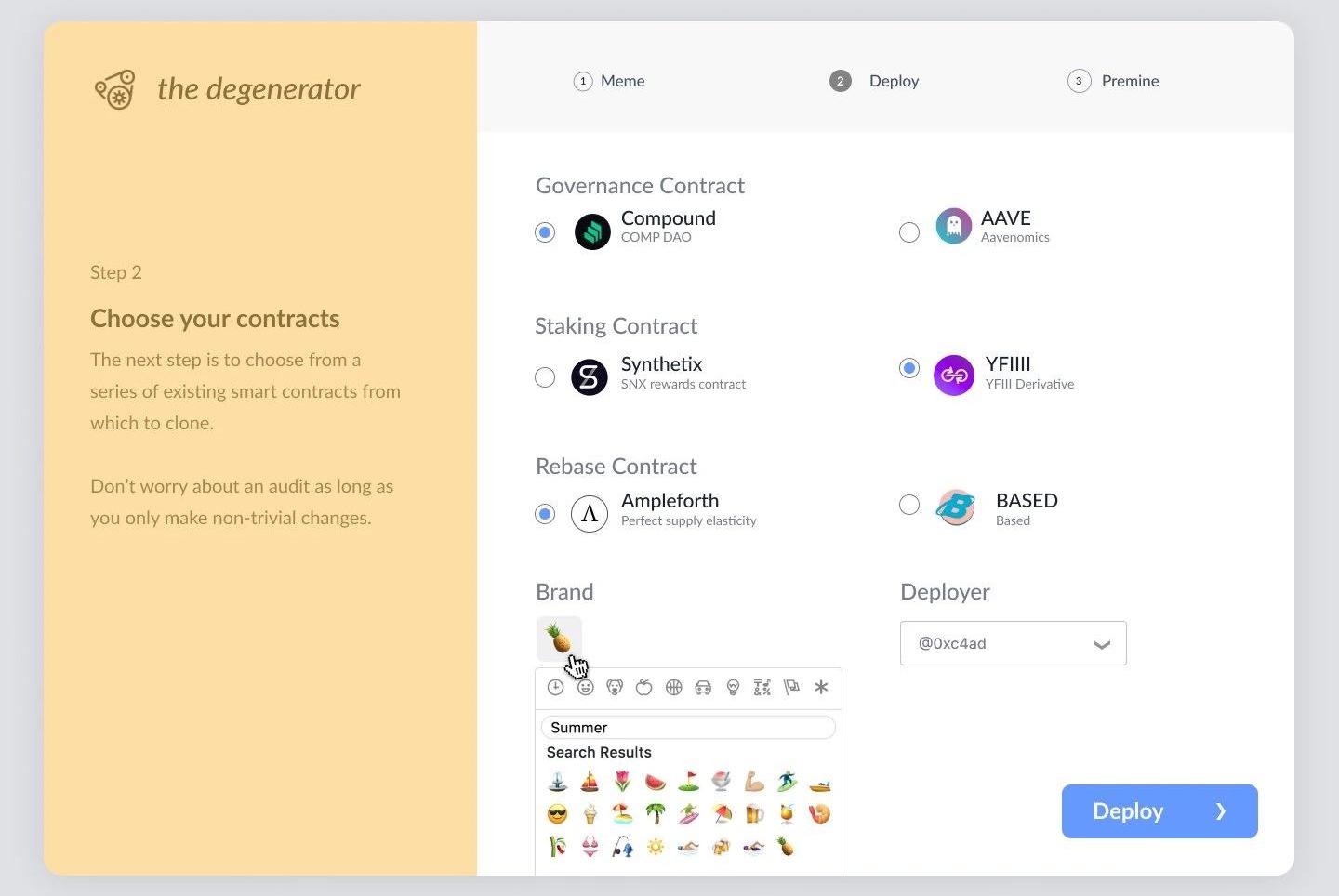 https://dontbuymeme.commeme的出生很有戲劇性,ConsenSys的JordanLyall在推特上發文稱“可能只需要5分鐘,就可以發布一個假的DeFi項目”,并附上一張名為degeneratorapp——批量發布DeFitoken程序的截圖。而后不久,就有人據此發布了一個菠蘿的meme幣。當天meme的成交量就到達了120萬美金,最低價為6美金,現價為32美金。