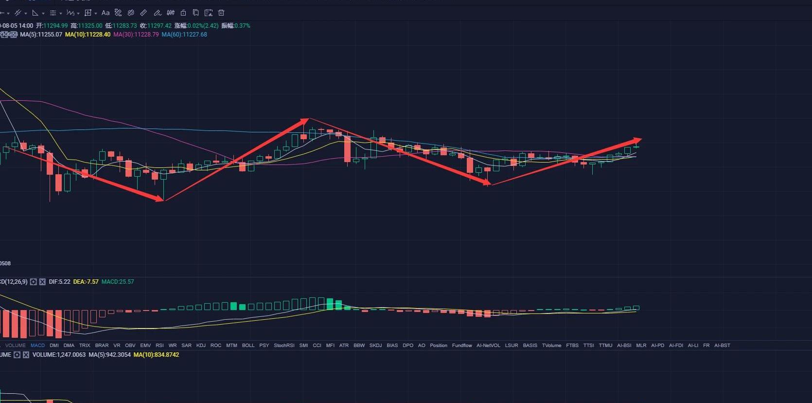 不過話說回來,今天若是能繼續上行站穩11400美元,明日就有可能拉出大陽線,因為近兩日震蕩的主要原因是每次前一日的收盤位置不好,導致第二天沒有什么上沖的動力,今天要是能站穩11400美元,就說明明天就設在11400美元上方開盤,還有機會可以沖一波。目前已經在11300美元附近,還差100美元左右,只能說有機會,但希望很渺茫,除非是黃金繼續強勢上漲,強勢到能帶動比特幣的行情,否則,上午到目前一直持續反彈,根據近幾日震蕩的節奏,接下來大概率還是迎來回調。