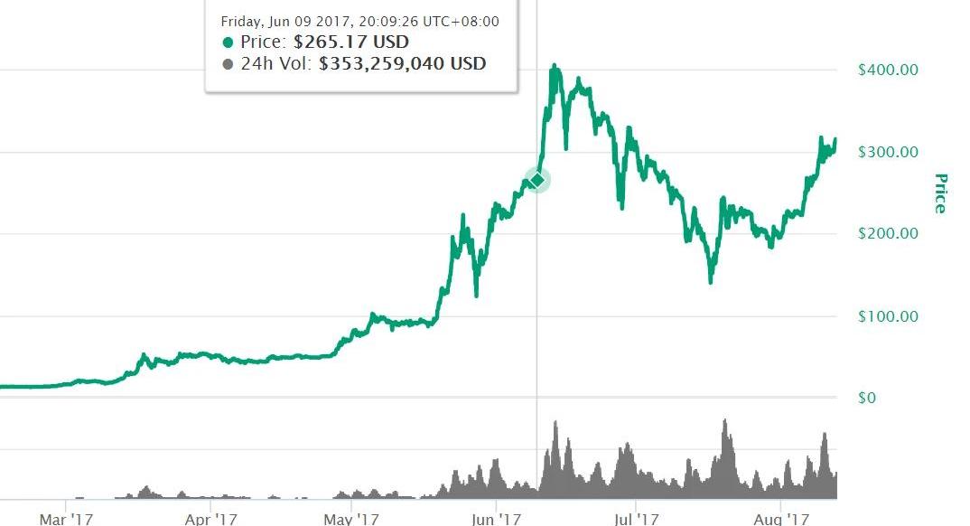 瘋狂的ICO亂象使得七部委發布《關于防范代幣發行融資風險的公告》而2017年5月到6月正是以太坊價格飆升、ICO成流行之勢的時候。只要會講故事,有適當的曝光,項目想不成功都難。