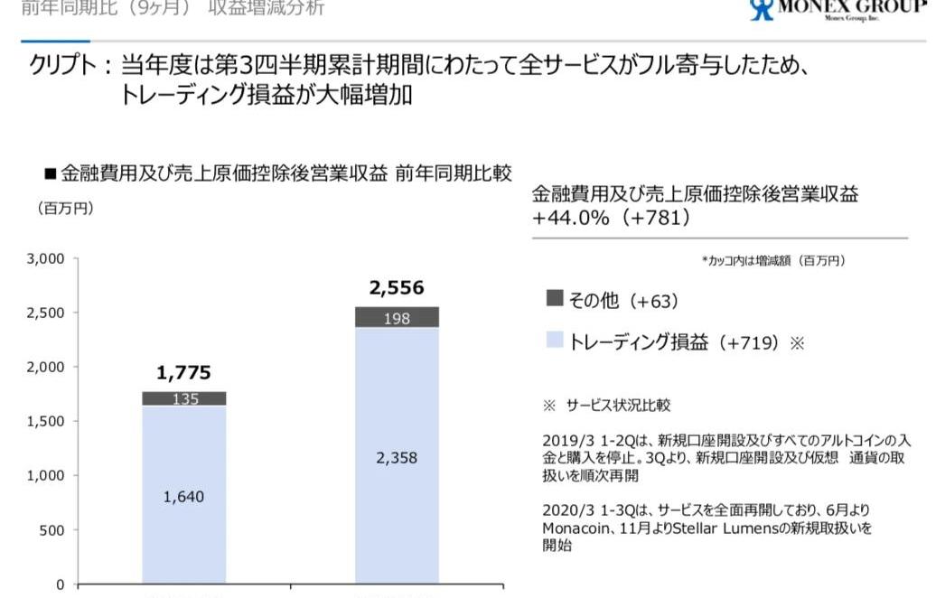 報告顯示,2019年4月-12月,該集團加密貨幣相關業務因子公司Coincheck恢復了所有服務,凈交易收入大幅增加,扣除財務費用和銷售成本后的營業總收入同比增加44.0%,從上一財年同期的17.75億日元增長至25.26億日元。成本方面,Coincheck在2019年1月正式完成注冊后,進行了大規模的成本削減,同期銷售及一般管理費用開支減少25.9%,從上一財年同期的33.93億日元降低至25.25億日元。