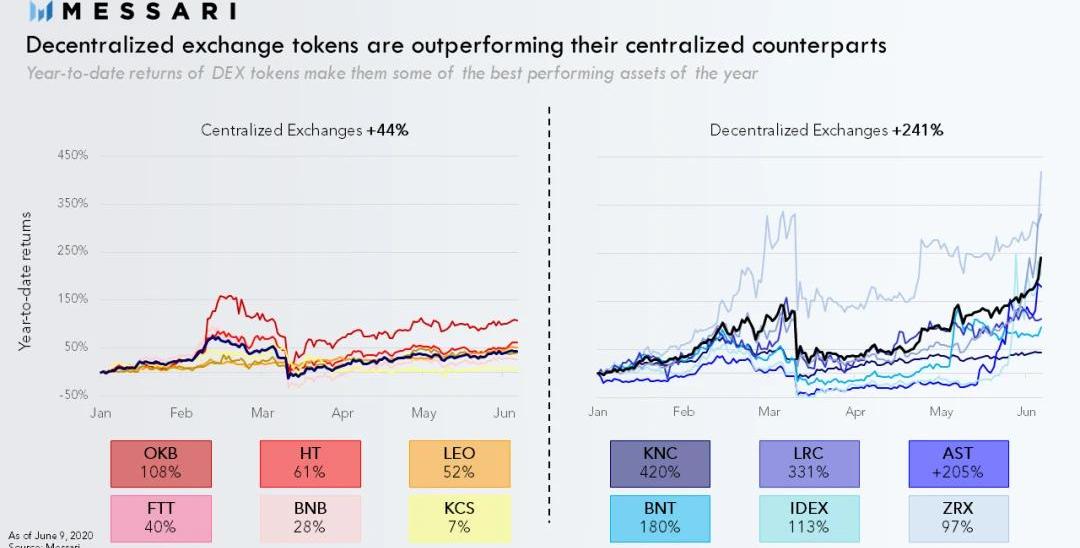 若是你手里一手的BTC或是ETH等主流幣,亦或是BNB,HT等平臺幣,過去一個月對你來說,應該是一個波瀾不驚的月份,只要你沒碰合約杠桿。然而你要是看完上篇文章去買入了DeFi相關的幣種,無論是MKR,Lend,還是REN,Bancor,亦或是文中提到的KNC,這30天,應該都是賺的盆滿缽滿的30天。除了DeFi幾大主流幣種幣價在過去30天紛紛有著2-4倍的“驚人表現”之外,許多其他數據,也昭示著DeFi局部性牛市的到來。1.DEX幣價以及交易額數據-很明顯的可以看出,過去幾個月,DEX的代幣漲幅,要遠超傳統CEX各大交易平臺幣的漲幅,而這種漲幅,主要也是由于DEX交易量持續增高的影響。