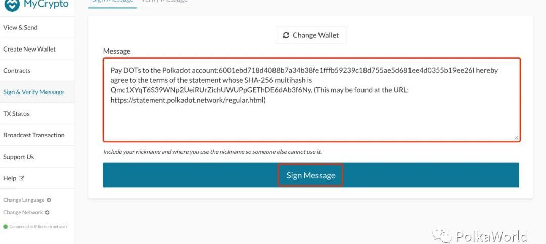 5.解鎖錢包后,把剛剛在PolkadotJS的信息粘貼到"Message"框中,并點擊SignMessage。