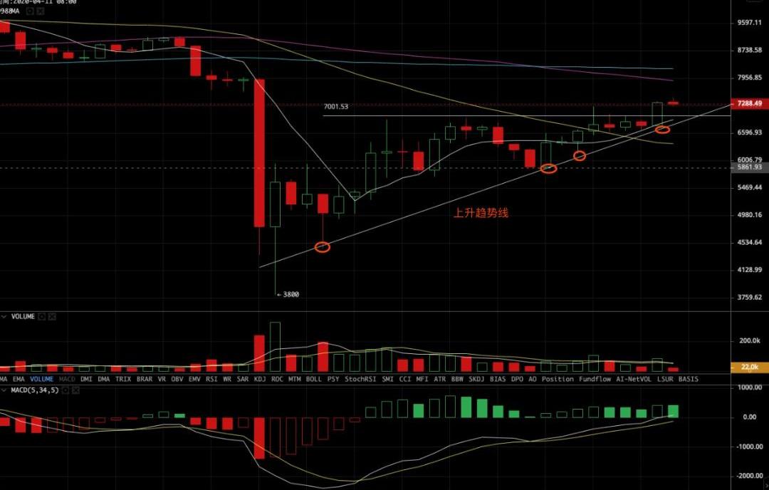 XRP/HKD+0.18%BTC一日間,從6750美金反彈至7400美金,ETH更是從142美金漲至176美金,漲幅高達23%。而在這之前的4月2日至4月6日,大盤則是一直維持在6600-7000美金區間整理走勢。面對劇烈的行情突變,我們需要有應對之策,而不是在行情來臨時拍斷大腿,甚至是逆勢而為,破罐子破摔。首先,我們要明確的一個事實是,金融市場行情自有其規律,不以人的意志為轉移的,其未來趨勢也是不確定的、無法準確預測的。我們能做的,是運用各種方法,包括基本面分析、技術面分析、量價關系分析、市場投資者情緒指標、市場輿論形勢等,來預判行情的變化,使自己的分析和判斷契合市場走勢,順勢而為。既然行情本身無法預測,那么我們能做的,就是提升自己的風控能力,做各種預案:趨勢行情時,緊跟趨勢;區間震蕩行情時,同時做兩手準備,突破和跌破的情況下,我們要怎么應對,來保證本金安全和盈利空間。因此,交易時,切忌盲目猜漲跌,賭方向,而是要去印證市場的走勢,完善自己的交易系統。其次,交易系統對于每個人來說,都不盡相同,因為自身的經歷、投資水平、資金量、風險偏好、倉位管理等都存在差異化,并沒有一套放之四海皆準的定律。但整體來講,是要避免情緒化交易,而是按照自己的計劃來執行交易。大家做單的時候,是不是有這樣的感覺,無論行情怎么變換,你都會感覺到糾結,對于我們的大腦來說,無論做任何事情,是迫切的想得到一個明確的結果,而不是延緩滿足感。當行情上漲的時候,你擔心漲的太快,擔心錯過上車機會,擔心莊家搞事情收割;當行情下跌的時候,你擔心會繼續下跌而不敢抄底,擔心買入被套,擔心自己被收割;而當行情區間震蕩時,你又很郁悶,垃圾行情為什么不漲,莊家為什么不搞事情?抱著這樣患得患失的心態,是沒法好好投資的,一旦你的心態亂了方寸,大概是要做出錯誤的決策。投資其實是很簡單的事情,買入賣出就完事了,至于是獲得利潤還是虧損,這個是市場說了算,交易前你可以預判行情,但一旦進場交易,你便要隨著行情的波動來順勢而為,而不是按照自己的預判來一意孤行和強加執念,因為這樣的結果是注定的,勞心勞力,最后還虧損。回到行情上,昨天和今天的行情,分別對應區間震蕩后的向上突破行情、持續行情、和拉升后的慣性行情三個階段,短時需留意沖高回落的風險。沖高回落,一般對應兩個支撐點,和一個趨勢線,通過這兩點一線來判斷反彈行情是否延續的問題。支撐點是用來布局短線介入點位的,而趨勢線是用來判斷中長期的大盤走勢和方向性的問題,因此可以在大盤回撤至支撐點附近,可以適量補倉,而在跌破趨勢線后,需要及時止盈止損操作。