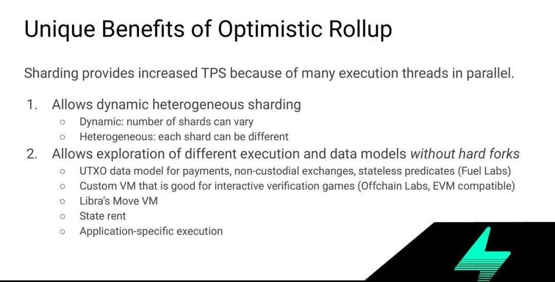 那么,為什么Rollup可以擴展吞吐量呢?因為交易的執行完全放在鏈下。這一點意義重大,因為顯然,這是最大限度解決了交易執行上的瓶頸。但作者同樣指出,大家對rollup方案的吞吐量提升有一些誤解。常見的方法是根據單區塊的Gas上限和calldata的Gas使用量,以及出塊的時間,得出rollup的TPS。但這樣是很片面的。原因在于,如果大家只使用一條rollup鏈,即交易不并行處理,則除非提高對節點的硬件要求,否則吞吐量跟原來應該是一樣的。所以,使用rollup的好處,可以跟分片比擬。因為分片之所以能提高吞吐量,不是因為單分片上的節點更少,而是因為可以并行處理交易;此外,還能在不同分片上使用不同的交易執行規則。rollup其實是用同樣的方式來拓展吞吐量的。