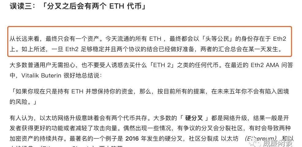 簡單來說,就是以太坊在1.0升級到2.0的時候,是存在分叉的可能的,在技術上是可以實現的。那么如果社區、礦工和投資者們認為現在的以太坊更好的話,他們可以選擇不追隨2.0的新版本,而是永遠留在1.0的舊版本。那么,事實上其實就產生了分叉。BCH的分叉話題剛落下,ETH的分叉話題又開始了。不同于bch的分叉只是一個幣的關系,以太坊的分叉牽扯的利益關系就比較多了,且不說上面有數不盡的Token在以太坊上發行,還有最關鍵的是USDT也有數十億美元在以太坊的鏈上發行,這影響就比較大了。比如usdt,分叉完事兒之后,就會出現eth1.0的usdt和eth2.0的usdt,那么它只能承認其中一條,如果都承認,那么也就順便超發了一倍usdt。前兩天有一篇關于以太坊2.0的誤會的解讀文章熱度挺高,作者是TrentonVanEpps目前在Whileblock團隊,那個團隊幫著ETH2做事情,對于目前以太坊2.0的情況進展還是比較熟悉的。我仔細看了一下文章,發現他對“分叉之后會有兩個ETH代幣”的解釋反而讓我們更加確認,的確會產生分叉,不過最終會殊途同歸。
