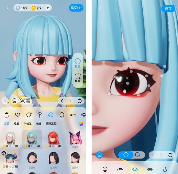 與傳統QQ秀相比,超級QQ秀有很大的進步,畫風精美,受到很多年輕用戶的喜愛。整個捏臉系統的操作直觀簡單,足以讓用戶打造出獨有的虛擬形象。用戶可以通過臉部的調節點捏臉,無需調整繁瑣的參數。目前版本提供了豐富的發型、眉毛、眼睛、嘴巴、妝容、臉部模板等選項。