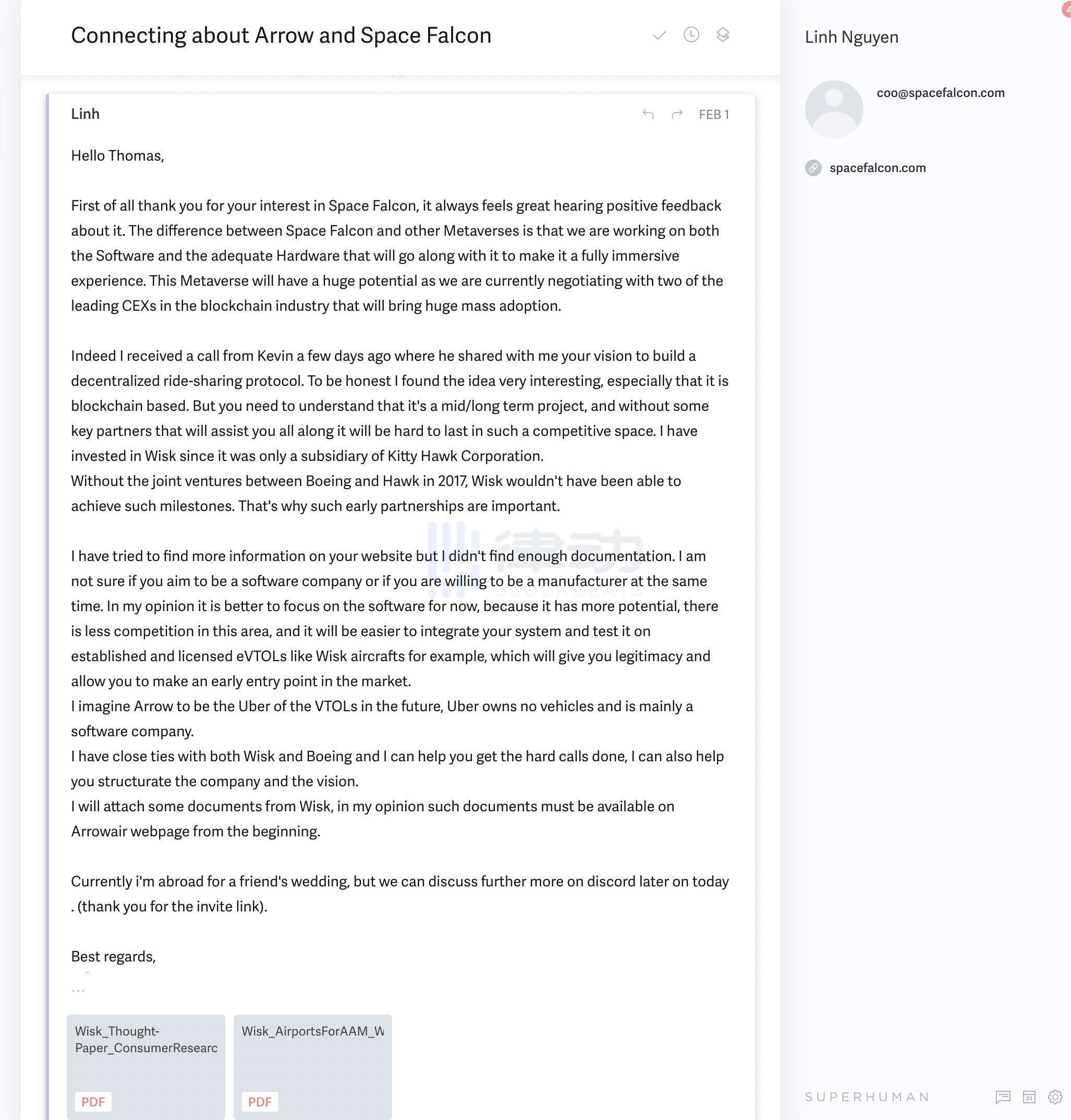 果然,她告訴了我她與波音及 Wisk 的人脈聯系,并提供了一些關于 Arrow 的想法。Linh 似乎很渴望幫助我們與波音建立潛在的合作伙伴關系。同樣,她的電子郵件語氣也有點奇怪,不過我還是認為這是語言障礙。