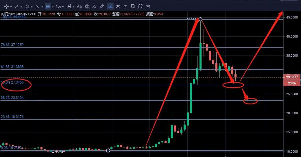 UMA:UMA屬于DEX里面的一個衍生品幣種,這個幣我觀察了很久,之前也都一直屬于震蕩,剛好這幾天出現了大幅度的波動,從圖中可以看的出來,3天時間幣價翻倍,目前開始走回調。從4小時圖看的話繼續回調的可能性還是比較大,下方先看斐波那契0.50的支撐,可以在附近埋伏1-2成倉位,如果一旦下方破位,我們再繼續在0.382處加倉。在這輪牛市里,我們不怕它回調修復,就怕它高位震蕩。