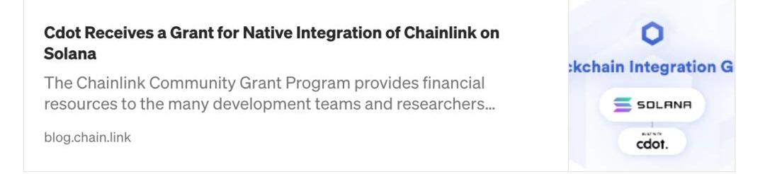 在最近由Chainlink、Solana基金會、Serum聯合贊助的提案計劃中,Cdot成為勝出的項目。Cdot將用獲勝獎金進行Chainlink-Solana的本地集成,幫助開發者在Solana區塊鏈上搭建各種可以連通外部智能合約的應用。
