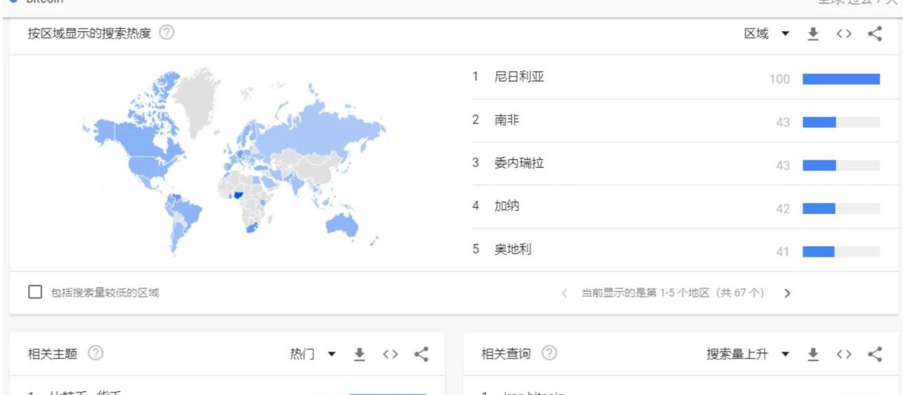 過去七天,全球Bitcoin的谷歌搜索相對值在04日達到峰值,較上月底上升了25%左右。熱度排名前七的國家地區分別是尼日利亞、南非、委內瑞拉、加納、奧地利、瑞士和德國。在搜索量上升排名中,iranbitcoin位列第一,這與近日的中東局勢升級有關。