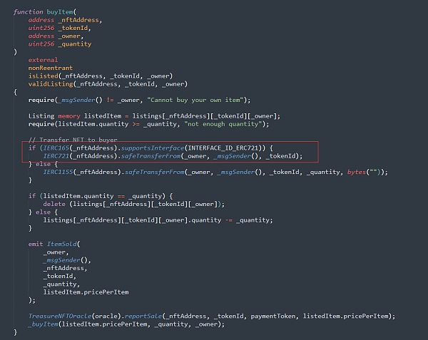從代碼上來看,合約的buyItem函數在傳入_quantity參數后,并沒有做代幣類型判斷,直接將_quantity與_pricePerItem相乘計算出了totalPrice,因此safeTransferFrom函數可以在ERC-20代幣支付數額只有0的情況下,調用合約的buyItem函數來進行代幣購買。
